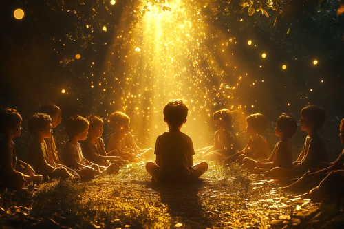 3d CGI animated image of a child sittingwith a group of children, glowing with golden light, the light shining so brightly that the the darkenss and shadows around them begin to retreat, very detailed, bright colors, childrens book image, cinematic lighting, --ar 3:2