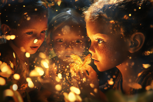 3d CGI animated image of a small group of children smelling the fresh fragrance of light, their eyes wide with wonder, as golden light is inhaled, the darkened dead world around them begins to comes alive with vibrant colors and light. very detailed, bright colors, childrens book image, cinematic lighting, --ar 3:2