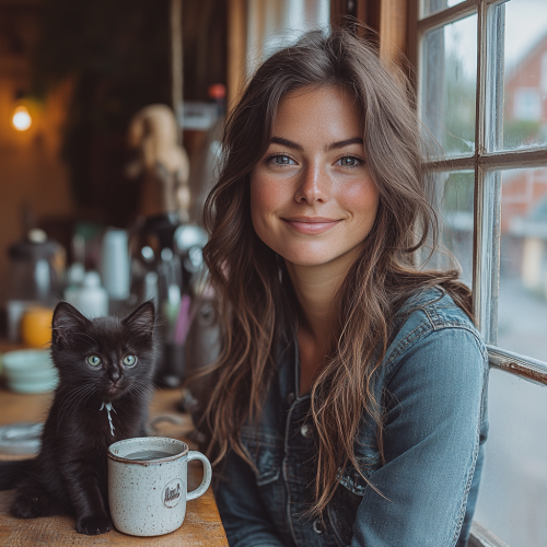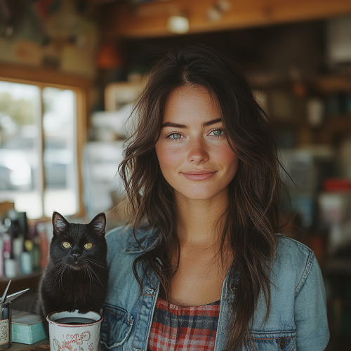 Photo of a natural 26-year-old badass fresh faced woman in a hair salon with skylights: wearing denim and flannel. Baby black kitten. Scissors and mug of tea on a table. Out the window, a small town on the California coast. Oak trees and ocean spray. Water magic. Hygge. Photo taken using a Canon EOS R camera with a 50mm f/1.8 lens, f/2.2 aperture, shutter speed 1/200s, ISO 100 and natural light, Hyper Realistic Photography, Cinematic, Cinema, Hyperdetail, Ultrahd, Color Correction, hdr, color grading, 8k happy, smiling --stylize 750 --v 6.1 --ar 1:1