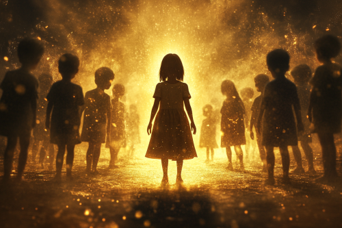 3d CGI animated image of a girl child standing with a group of children, glowing with golden light, the light shining so brightly that the the darkenss and shadows around them begin to retreat, very detailed, bright colors, childrens book image, cinematic lighting, --ar 3:2