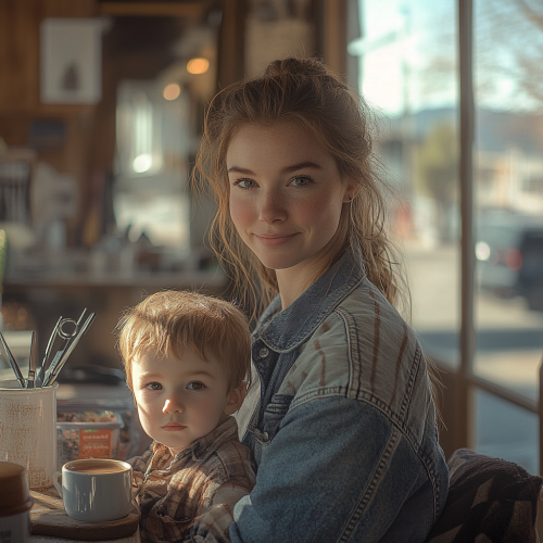 Photo of a naturally beautiful 26-year-old fresh faced woman in a hair salon with skylights: wearing denim and flannel, standing behind a child in a chair. Scissors and mug of tea on a table. Out the window, a small town near the California ocean. Photo taken using a Canon EOS R camera with a 50mm f/1.8 lens, f/2.2 aperture, shutter speed 1/200s, ISO 100 and natural light, Hyper Realistic Photography, Cinematic, Cinema, Hyperdetail, Ultrahd, Color Correction, hdr, color grading, 8k happy, smiling --stylize 250 --v 6.1 --ar 1:1