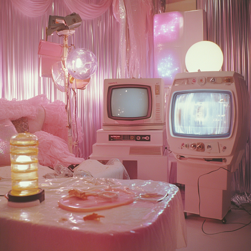 cafe, noisy Videotape VHS quality. camcorder video tape, old camera phone style. bad quality. Scene from a high teen movie with pink and silver,glow - visual eperiment at a menhir made out of girls equipment, saturn, white ruffles, stage lights, neon high.