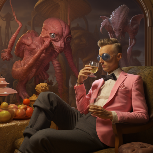 a cinematic photo of multiple aliens drinking wine at a party with a human man, in the style of wes-anderson :: a stylish, eccentric 40 year old man is drinking wine with the aliens :: the stylish man has pompadour side swept hair:: 2