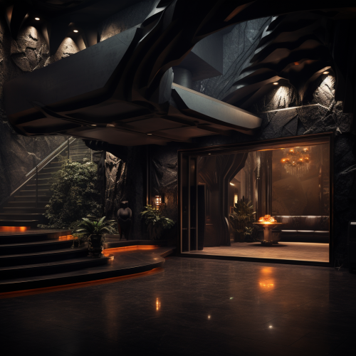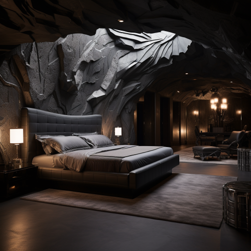 master bedroom of a batman inspired mansion within a cave, darker toned, modern, photorealistic, ultrarealistic, photography, fine details, hyper quality, megapixel, elegant, high quality, de-noise, post-processing, zoomed out, cinematic, real estate photography