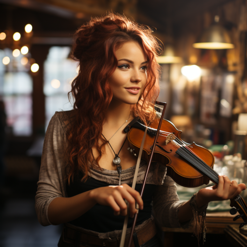 A candid style screen grab from a movie, detailed photo of beautiful half elf with red hair playing fiddle to a crowd, old tavern architecture, cinematic, bright, brilliant, photorealistic, Rustic, shot with a Panasonic Lumix GH5S with Sigma 18 - 35mm f/ 1. 8 DC HSM Art lens. --s 1000 --c 2 --v 5.2
