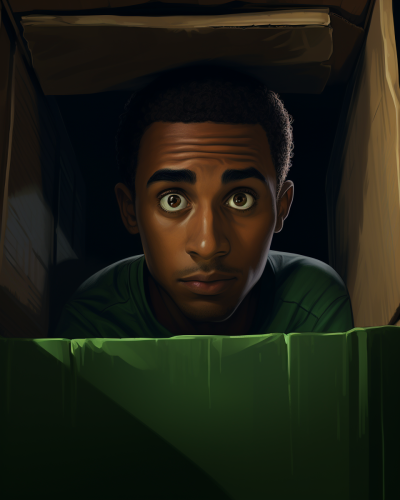 a poster for a triller from Wes Craven about a 22 cute black guy with a green tshirt view from behind hiding behind a big box from someone in a creepy warehouse. Sense of triller, suspense. Dynamic pose, cinematic --ar 4:5