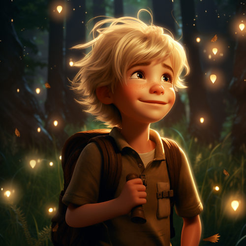 pixar style, blond bushy hair boy of eleven, leather satchel over one shoulder, in forest with fairies and fireflies, smiling,pixar style, cinematic
