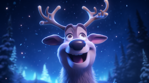 cinematic image of a blue nose reindeer smiling, night sky, lights background, 16K --ar 16:9