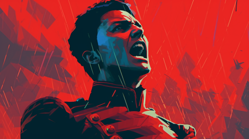 Masterpiece illustration by Alena Aenami of A close-up profile shot depicts a British redcoat soldier's terrified face and neck in the foreground. The soldier screams in horror as Goddess Kali's long, powerful tongue is visibly wrapped tightly around his neck, the muscles in her tongue tensed. Her sharp fangs glisten right behind the soldier's neck. The soldier's eyes are wide with pain, veins bulging from the constriction of Kali's tongue. Other fleeing soldiers blurred in the background. Dramatic chiaroscuro lighting emphasizes Kali's tongue as the central element. Masterpiece illustration in Alena Aenami's signature style, Depth of Field, Hyper - Detailed, Beautiful Color - Coded, Insane Details, Editorial Photography, Photorealistic, UHD, HDR, HD, Natural Lighting, Canon EOS R3, F1, 4, ISO 200, 1160s, 32K, RAW, Pro Photo RGB, High Quality, 400MP, Megapixel, Super - Resolution, Saturated Colors, Sun reflections, Ray tracing Reflections, exposing whole body, Cinematic, Highly Detailed, unreal engine 5, ultra detailed, 8k, hdr, cinematic lighting, depth of field, Photorealistic, Highly Intricate Details, ultra high, ultra detail, Photorealistic, Cinematic, Highly Detailed, Camera Shots, Dramatic, Realistic, high quality, hd, Chromatic Aberration, GB Displacement, Scan Lines, Ray Traced, Ray Tracing Ambient Occlusion, Anti - Aliasing, FKAA, TXAA, RTX, SSAO, Shaders, OpenGL - Shaders, GLSL - Shaders, Post Processing, Post - Production, Cell Shading, Tone Mapping, CGI, VFX, SFX, insanely detailed and intricate, hyper maximalist, elegant, super detailed, dynamic pose, photography, volumetric, ultra - detailed, intricate details, 8K, super detailed.volumetric lighting --upbeta --stylize 1000 --ar 16:9 --v 5.1