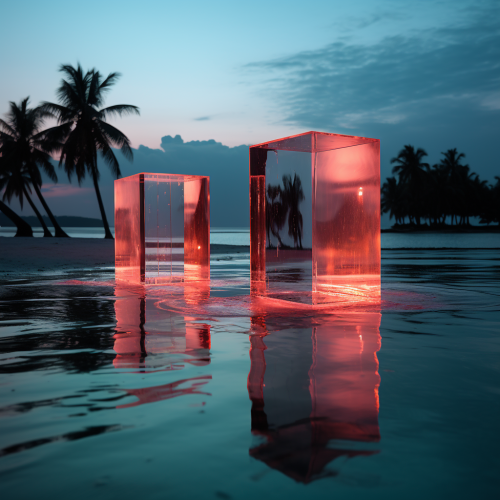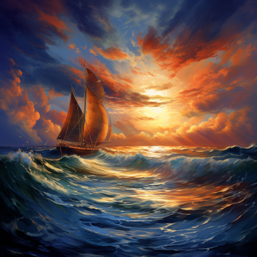 see after the storm, calm sea, sail boats, cloud, god rays, hyper realistic, atmospheric, blue, orange, white shimering of waves, cinematic, dramatic lights, psychedelic art , cinematic, sunset--no wind