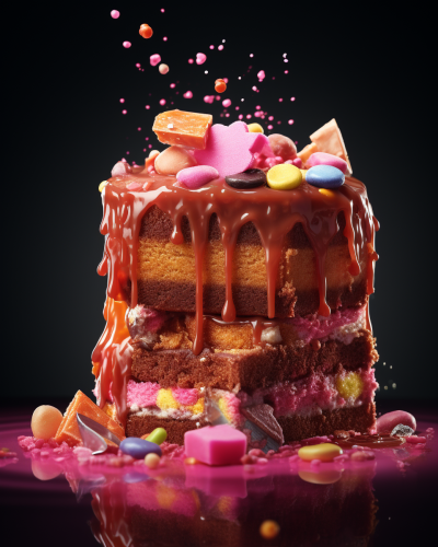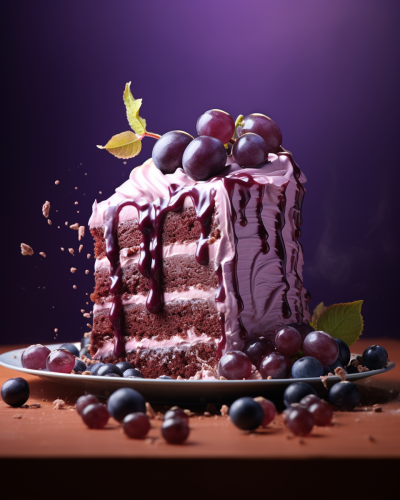 grape cake, surrealism, plain color background, sharp focus, cinematic lighting, product shot, unreal engine, octane render --ar 4:5
