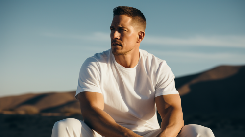 cinematic fujifilm photo 400 DPI large channing tatum in white crew Tshirt soft ethereal glow elegant sitting outside blue minimal sky --ar 16:9 --style raw