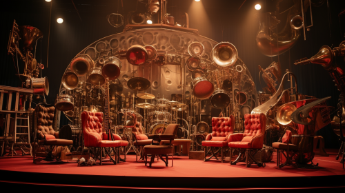 Conceptual Musical Comedy Show, 70mm, wide shot, panavision, enormous Musical Instruments --ar 16:9