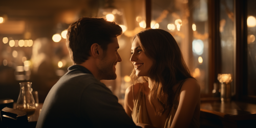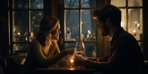 side view, a couple's first date, restaurant, amber light, champagne, Wally Pfister, warm lights, cinematic, anamorphic 24mm f/1.8 --ar 2:1