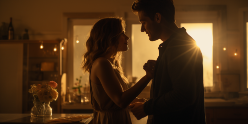 side view, a couple's first date, amber light, champagne, Wally Pfister, warm lights, cinematic, anamorphic 24mm f/1.8 --ar 2:1