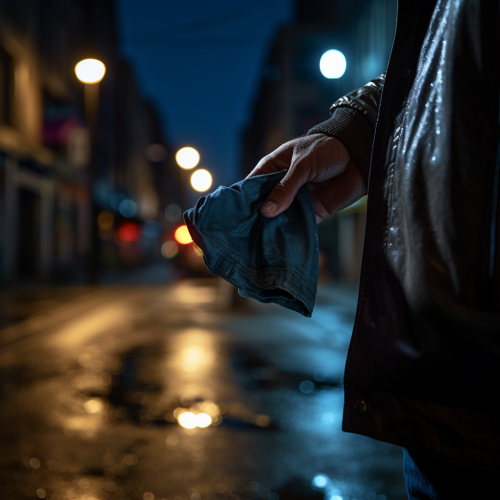 A hand holding just one little piece of a scratched and torn piece of clothing found in a investigation in a crime-scene at street, noir ambience, at night, very dark, very few lights, cinematic light, 8k resolution, ultra-detailed, photo-realistic