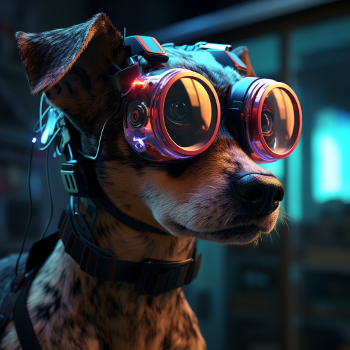 dog playing, Intriguing, Cyberghetto, Geek, close-up, Zbrush rendering, Cinematic, Installation, chromatic colors, Dreamcore, flood lighting, Ultra realistic