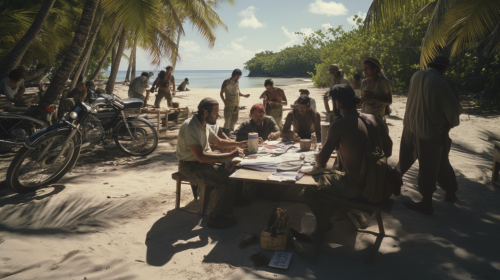 A table of engineers with plans in the middle of a beach area with native mexican quintanaroo jungle is surrounded by men with eco helmets,movie still by Baran bo odor, andrei Tarkovsky The shot is expertly framed using an ARRI ALEXA Mini camera, paired with a 25mm f/ 1. 4 Zeiss lens for its cinematic quality and ability to capture the futuristic atmosphere. The camera settings are an aperture of f/ 2, ISO 800, --ar 16:9