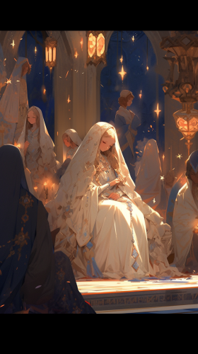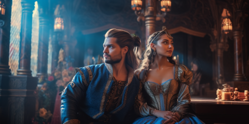 A cinematic shot of a medieval man, and a young woman inside the colorful fantasy palace hall, realistic, photoshoot, 8k, dynamic lighting, daylight, volumetric, bluish post-processing, post-production, ultra-detailed, high-level photography, --ar 2:1 --v 5.1