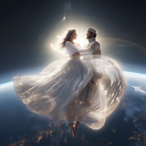 a man and a woman are floating in space above the earth. A man and a woman are connected by a light ball in the chest area, the light from the ball flows to the ground. the man is dressed in a hussar uniform, the woman is dressed in a long white dress with a hood. realistic cinematic, 8k