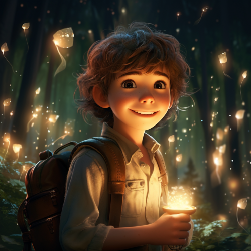 pixar style, brown bushy hair boy of eleven, leather bag over one shoulder, in forest with fairies and fireflies, smiling,pixar style, cinematic