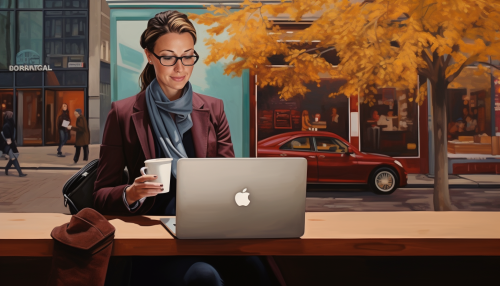 Landscape realistic oil painting of a friendly looking business woman wearing a blouse and trousers, sitting using a laptop outside an old-style traditional coffee shop in Zurich Switzerland, the dominant colours are burgundy and teal, a black leather portfolio is sat on the table alongside coffees, midcentury, geometric, exaggerated, retro but modern feeling, 1960s architecture, tasteful, the style is a sophisticated editorial illustration, sketchy but precise, clean crisp lines, painterly, detailed, visible thick brush strokes, subtle paper texture, chic, the people are dwarfed by classic Swiss buildings, vivid colours, HD, atmospheric, cinematic, detailed, Cinematic Lighting, Natural Lighting, cinematic color grading, soft shadows, clean sharp focus, 16K, Cinematic still, Sharp focus, High quality, 16k, 8k image, HD, Sharp image, wide angle, --ar 7:4