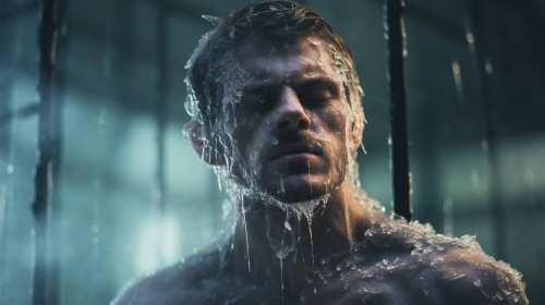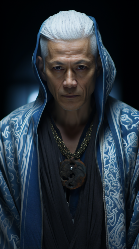 50 years old man, white short hair, using tengu brand, blue cloak, asian style, cinematic, epic, ultra realistic, extremely detailed, 8k, --v 5.2 --ar 9:16