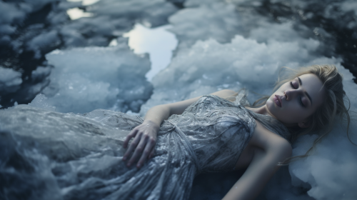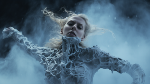 cinematic fashion editorial, photorealistic asian model with silvery gray hair, extremely fit body, tight latex catsuit, with straps, gold and silver, partially transparent, , silver metallic puffy, ultra-detailed:: standing in white sands desert dunes, overcast lighting, gray clouds, motion, swirling, wind, dusty, sand storm, depth-of-field, active shot on Kodak Ektachrome E100, medium shot --v 5.2 --style raw --s 250 --ar 3:4