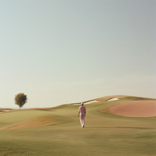 [Filmschool Shot] [golfer walking to the tee in Italian golf course] [Minimal Composition, Simplicity, Awardwinning Muted Colors] ar 16:9 — style raw
