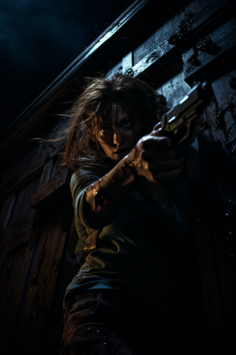 survival horror, dark midnight, rainy sky, dark black filter, very low angle, oblique view, ultra near view point, oil painting, High transparency, A woman wearing shorts reloading a handgun while keeping an eye on her surroundings with a serious face, in creepy rusty and dirty sillent narrow corner in a gothic mansion, Atmosphere, dramatic, Cinematograph, very dramatic, photo, sharp focus, cinematic, highly photorealistic, ultra detail, black soft lighting, dark black foggy arround, HDR, 8k --ar 2:3
