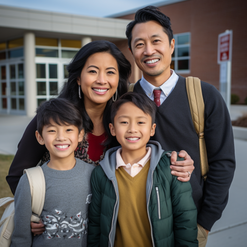 bright, happy photograph of a family posing in front of a school. dad is american, mom is american, son is asian adopted. cinematic lighting, realistic, 8K, Color Grading, Depth of Field, hyper-detailed, intricate details, Shot on 35mm lens, Tilt Blur, Shutter Speed 1/ 1000, F/ 22, Super - Resolution, Megapixel