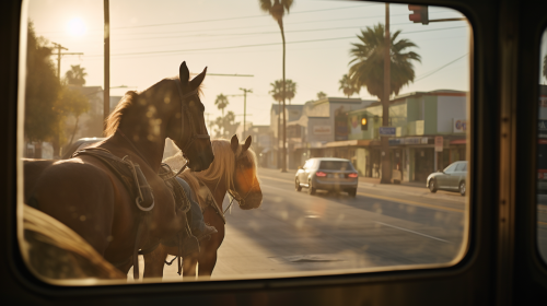 two horses as seen through the small windows of a hitching trailer on a busy los angeles street. cinematic photo, multi-panel compositions, in the style of movie still, in the style of atmospheric shots, brown, yellow and beige --ar 16:9