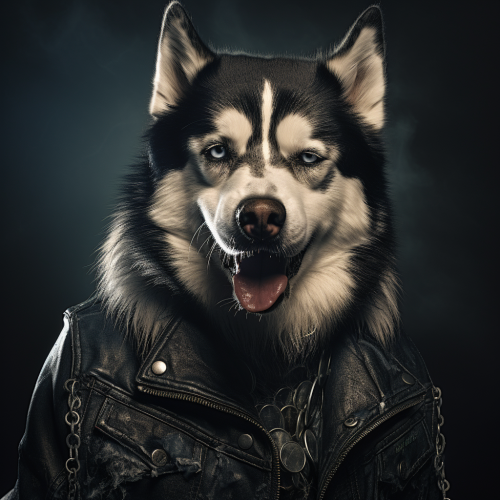 A realistic portrait of a Husky Dog dressed as a metalhead, wearing a black leather jacket, cinematic Lighting