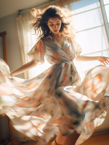 a photo of a Japanese woman in her 20s, full body shot, fit body, dancing, editorial photo, long-exposure, afterimagine, floral dress, in an empty room, sunlight from outside, pastel tone, silver lining, light accents, cinematic, realistic, 8k, vintage-style, --v 5.2 --style raw --s 250 --ar 3:4