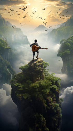 cinematic still of a lost world and musician flying above ground --ar 9:16