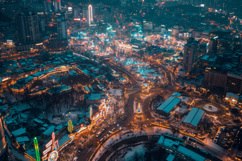 Aerial view of Seoul cityscape, featuring a bustling winter amusement park. Overhead view of vibrant attractions and snow-covered areas. Bright, festive lights illuminating the scene, capturing the lively spirit of winter festivities --ar 3:2 --v 6.0