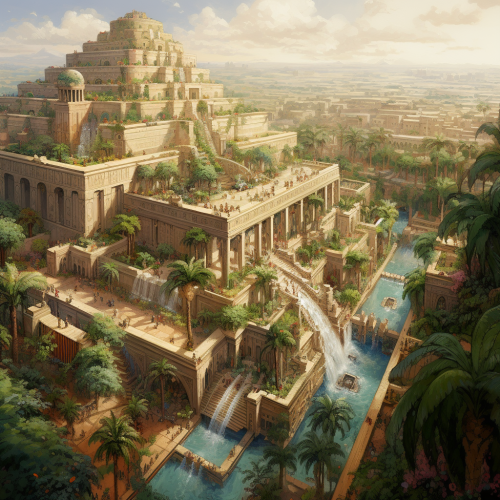 birds eye view of a sumerian city, babylon, hanging gardens, lush greenery, massive walls, busy streets, blotchy watercolor