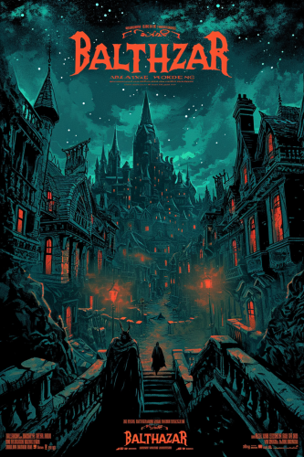 A horror movie poster with the calligraphic words "BALTHAZAR", depicting a macabre cityscape under a starry sky --ar 2:3 --v 6.0