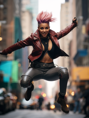beautiful Latina cyberpunk girl with Mohawk hair jumping toward camera in a New York city full body --ar 3:4