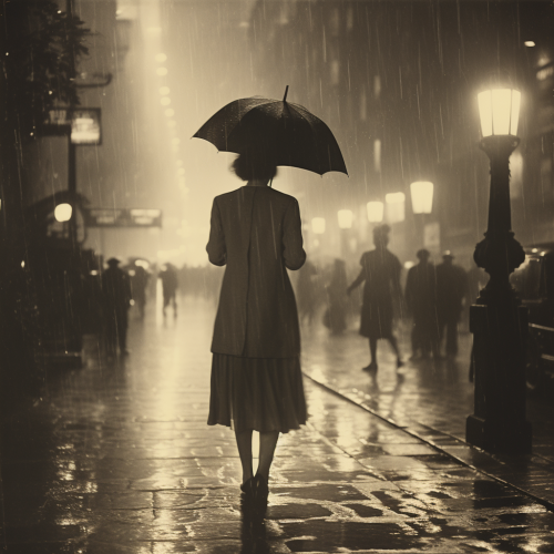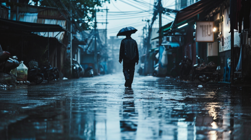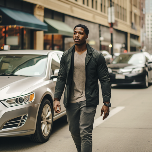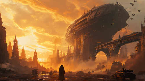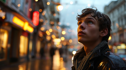 a dramatic shot of the Male Main character age 25 with short brown hair and light blue eyes walking down a street looking up at the sky in a serious expression --ar 16:9 --v 6.0 --s 750