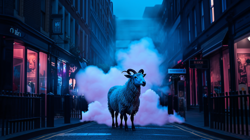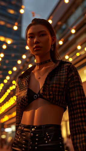 Photorealistic shot of half or full body - portrait style, on a city street at a photo shoot location, beautiful woman looks like a European model, glamorous makeup, expressive look, dynamics, wide angle view, close-up, in the city of the future, demonstration of Italian haute couture spring-summer 2024. Cute, Round, Open Mouth, Hourglass Shape, Gorgeous Eyes, Anime Blush, Screen Space Reflections, Diffraction Gradation, Chromatic Aberration, GB Shift, Scan Lines, Ambient Occlusion, Anti-Aliasing, FKAA, TXAA, RTX, SSAO, OpenGL shaders, post-processing, post-processing, honeycomb fill, tone mapping, CG, visual effects, sound effects, 35mm lens, f/3, accent lighting, global illumination, illustrated sports theme, Chaos 23 --ar 4:7 --style expressive --stylize 200 --niji 5