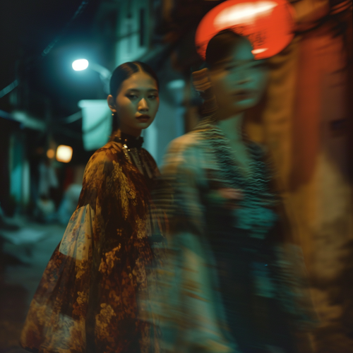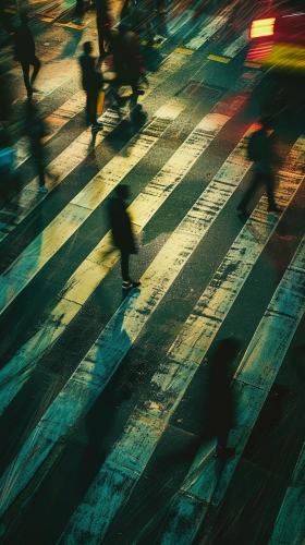 A slow shutter speed capture of a pedestrian crossing in Jakarta, from a nearby building's window, blurring the movement of people crossing, street lights creating a tapestry of motion trails, subtle greenish tint on shadows, muted colors, film grain --v 6.0 --ar 9:16 --style raw
