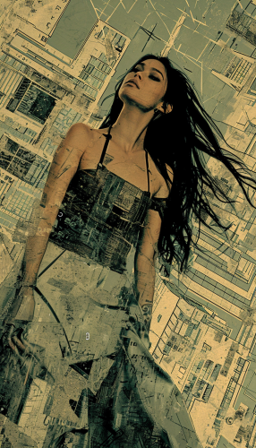 Low art, fresco art, modern art, large palette of bright halftones, beautiful woman, beautiful tactile volumes, full-length close-up, low waist, wide viewing angle, magnification, clear pencil along the contour, direct light, detail, high contrast, high quality . Italian high fashion style 2024. Background, city of the future --ar 4:7 --v 6.0