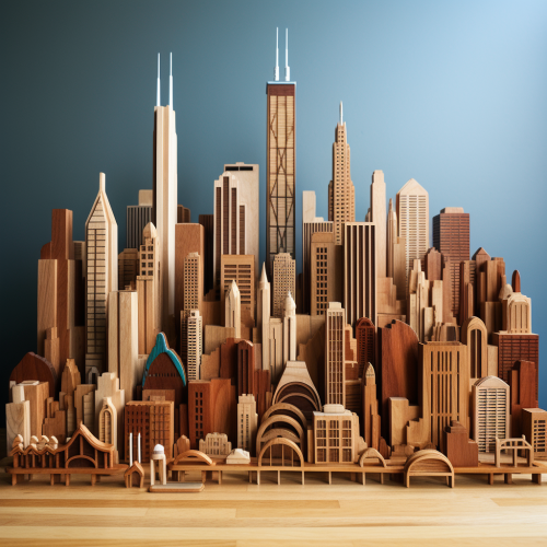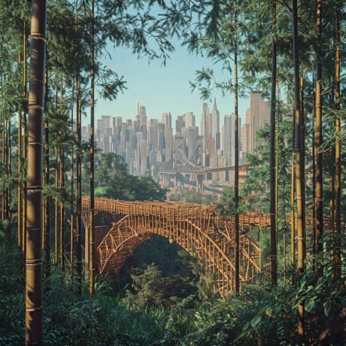 a large city bridge, similar to the bay bridge in Oakland made of bamboo. The background is a city skyline made of forest. Hyperrealistic. Time of day is noon. Clear skies, sunny lighting.? --v 6.0 --style raw