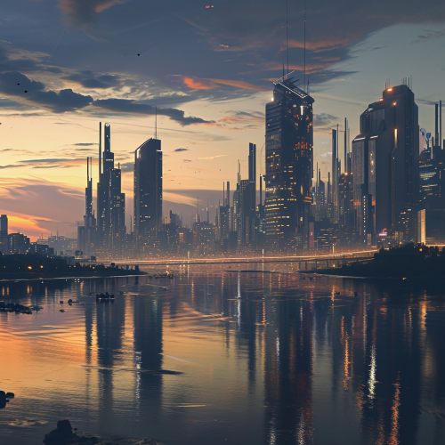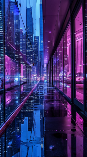 Infinite Mirrors' reflection of a bustling city skyline at dusk, creating an endless maze of reflections in twilight purple and electric blue --ar 9:16 --style raw --v 6.0