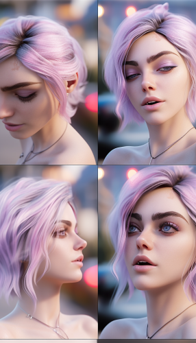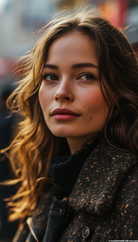 Photo-realistic half body shot - portrait style, on a city street at a photo shoot location, beautiful woman looks like a European model, expressive look, dynamics, wide angle view, close-up, in the city of the future, demonstration of Italian haute couture spring-summer 2024, glistening/shining, office cute blacks/charcoal reds/purple, pink/gold, cute, round, mouth agape, hour glass shape, gorgeous eyes, anime style blush, Screen Space Reflections, Diffraction Grading, Chromatic Aberration, GB Displacemnet, Scan Lines, Ambient Occulsion, Anti-aliasing, FKAA, TXAA, RTX, SSAO, OpenGL-Shader's, Post Processing, Post Production, Cell Shading, Tone Mapping, CGI, VFX, SFX, 35mm lens, f/3, accent lighting, global illumination, sports illustrated theme, --chaos 46 --ar 4:7 --style expressive --stylize 750 --niji 5