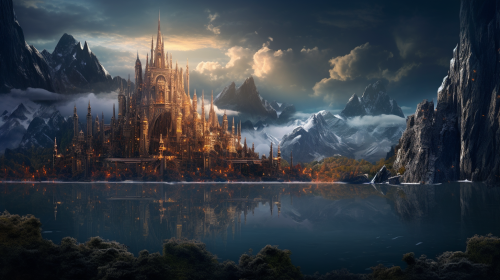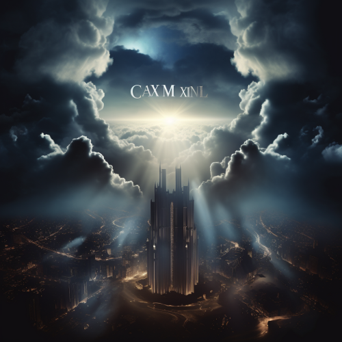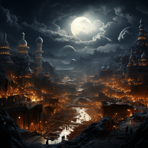 a depiction is shown of the city of mecca and its kabah mosque During the creation of Islam, in the style of dark and moody landscapes, hyper-realistic water, pop culture collages, celestialpunk, impressive skies, surrealistic cartoons, dark white and navy --s 750