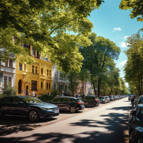 photo of a city street, free in the center, trees on the sides and a few parked cars. sunny day. front view