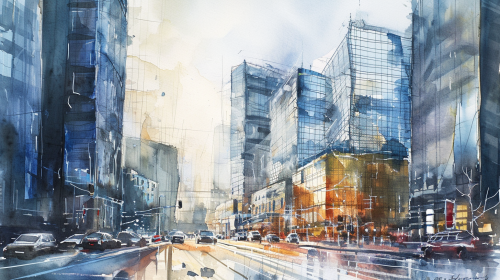 Watercolor painting blending realism with imaginative architectural designs, illustrating a cityscape in the midst of transformation, using soft hues and fluid strokes to convey progress in urban construction and design --ar 16:9 --v 6.0 --style raw --s 50