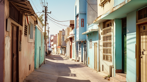 Analog color Photo: A quiet residential street in a colourful, dynamic, futuristic sci-fi city in France, Jaipur. houses with a blend of traditional and modern architecture. Thousands of houses as far as the eye can see --ar 16:9 --stylize 50 --v 6.0 --no cars
